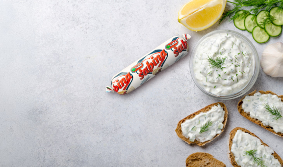 1. V miske zmiešame SABI tavený syr s tvarohom a bielym SABI jogurtom do hladkej konzistencie.